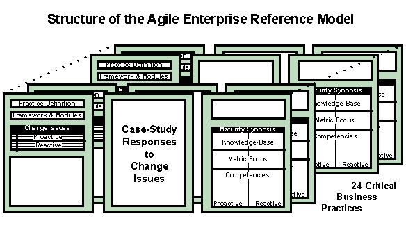 Section A (Part 1 of 4) An Introduction to the Reference Model Agile processes and strategic objectives for the agile enterprise have been the subject of a growing number of corporate investigations, research efforts, and government initiatives internationally since 1991; yet each year a more vocal demand for an enterprise-wide reference model is raised. This document answers that demand by providing the first comprehensive agile enterprise reference model. Sponsored by the Agility Forum, this 1996 reference model project had two principal goals: 1) design a reference model structure that effectively captures and displays the essence of enterprise-wide competency at both proactive and reactive change; and 2) validate the design with a rich, comprehensive example that provides an instructive reference case for an entire enterprise. The purpose is to provide a defining profile with examples for business managers and executives responsible for strategic planning, operational management, and reengineering. The reference model spans 24 interrelated critical business practices in 6 categories: strategic planning (3), business case justification (3), organizational relationship management (7), knowledge management (4), innovation management (4), and performance metrics (3). The seven organizational relationships focus on business units, employees, partners, suppliers, customers, information systems, and production systems. Each of the 24 practices is presented in a 35 page structure that provides: a generic definition, the framework and modules of a case-study practice that fits that definition, a set of generic proactive and reactive change issues, case-study responses for each issue, and finally, a change proficiency maturity synopsis that evaluates and displays the competency of the case example using the recently developed Change Proficiency Maturity Model. The case study providing the examples is of Remmele Engineering: a $100 million, four-division, five-plant, Minnesota-based machining company that serves aerospace, defense, electronic, medical, automotive, and electronic industries. Remmele was chosen very carefully for its observable broad proficiencies at change, discovered when the Agility Forum's Operations Focus Group conducted an analysis of production practices there in 1995 [1, 3]. It is important to understand that Remmele exhibits more competency at broad change proficiency than any other company we have examined to date and owes this competency to procedures that are instructive and exportable to companies of any size and in any business sector. Thus, the lessons to be learned from the Remmele case are not restricted in applicability to their specific industry, nor are they dependent upon Remmele's size or private ownership status. We define an agile enterprise as one that is broadly change-proficient; i.e., it exhibits competency at causing and dealing with change in the important competitive business practices of its business sector. There are three key concepts involved in this definition: change proficiency, critical business practices, and competency. Each of these concepts and the analytical tools employed in the case-study development will be discussed briefly. |